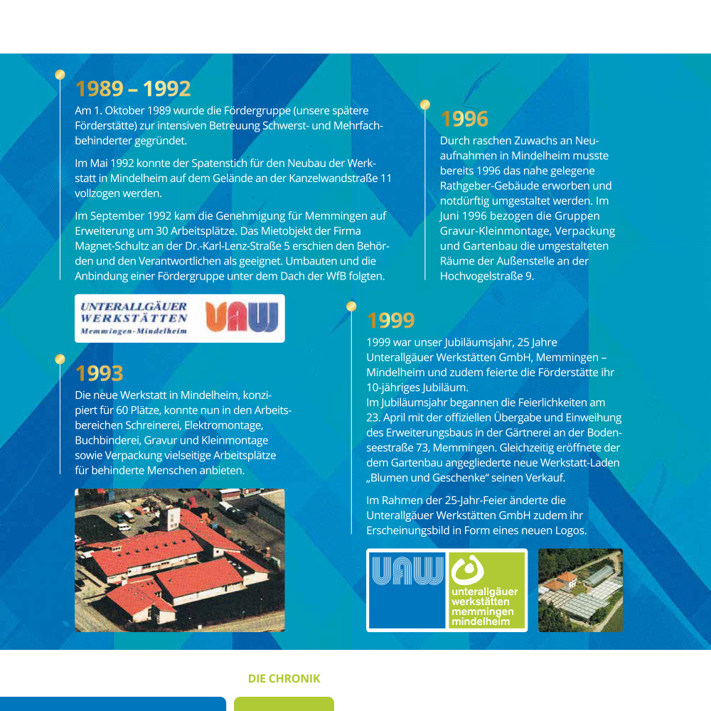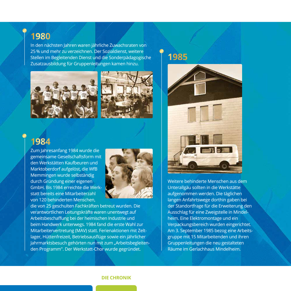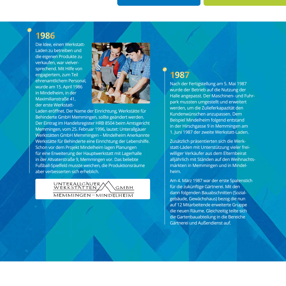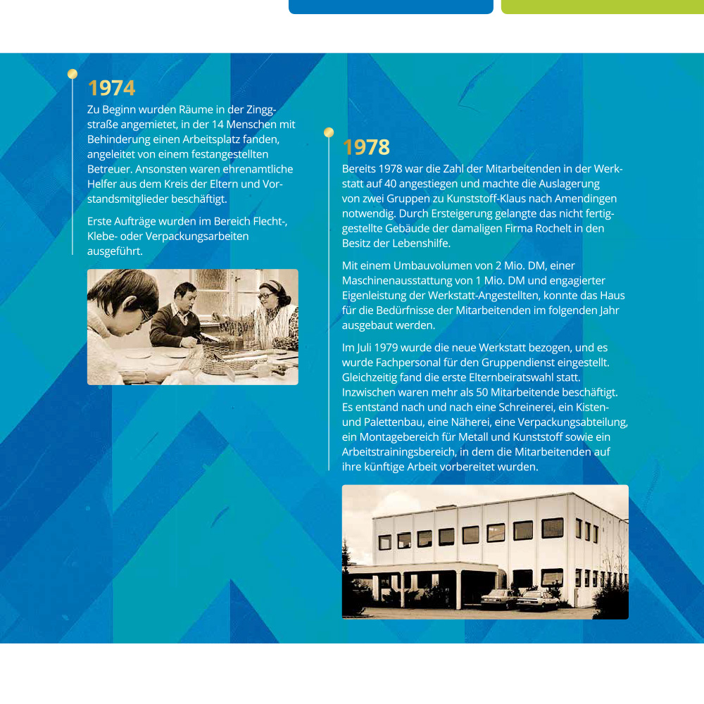 Seit unserer Gründung im Jahr 1974 haben wir uns kontinuierlich weiterentwickelt und sind in unserer Region zu einem bedeutenden Teil der Gemeinschaft geworden, die Menschen mit Behinderung unterstützt und ihnen eine wertvolle Arbeits- und Lebensumgebung bietet. Unsere Vision von Inklusion und Teilhabe hat uns geleitet und inspiriert, und jeder Schritt auf diesem Weg wurde vom hohen Engagement,