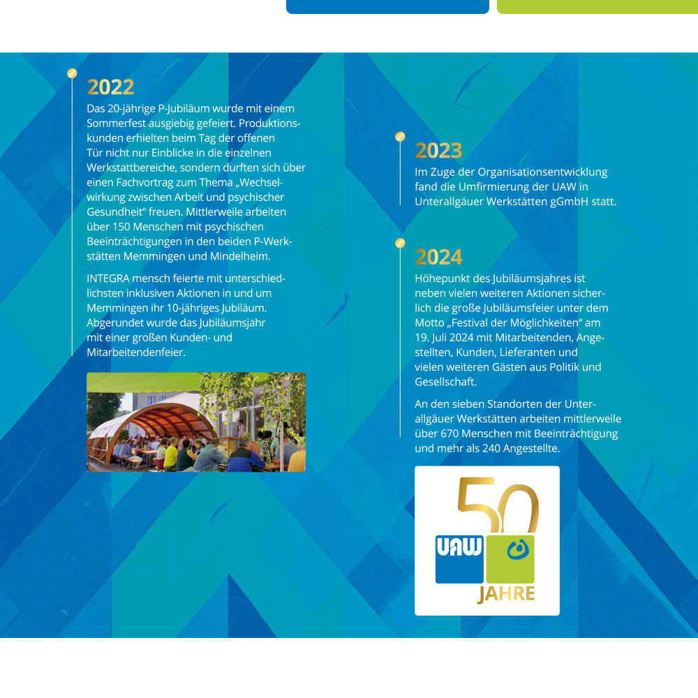im Namen der Unterallgäuer Werkstätten gGmbH heiße ich Sie herzlich willkommen zu unserem besonderen Jubiläum – 50 Jahre voller Engagement, Leidenschaft und bedeutsamer Begegnungen. Es erfüllt mich mit Stolz und Dankbarkeit, dass wir heute gemeinsam auf ein halbes Jahrhundert erfolgreicher Arbeit zurückblicken dürfen.