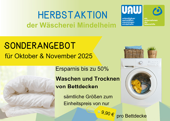 In unserer Wäscherei der P-Werkstatt Mindelheim wird täglich Wäsche von gewerblichen wie von privaten Kunden sortiert, gekennzeichnet, gewaschen, gebügelt und abholfertig zusammengelegt und verpackt. Auf Wunsch liefern wir gerne an. Das Leistungsspektrum umfasst Waschen, Bügeln und Mangeln von Berufs- und Arbeitskleidung, Gastronomiewäsche, Privatwäsche, Vorhänge und Hemdenservice. Die Wäscherei zeichnet sich durch einen schnellen Service, eine freundliche Atmosphäre, zuverlässige Qualität und faire Preise aus.